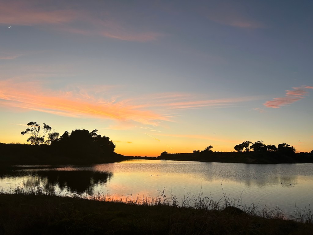 (Top photo: Night sky over our house; lower photo: UCSB Lagoon at sunset)