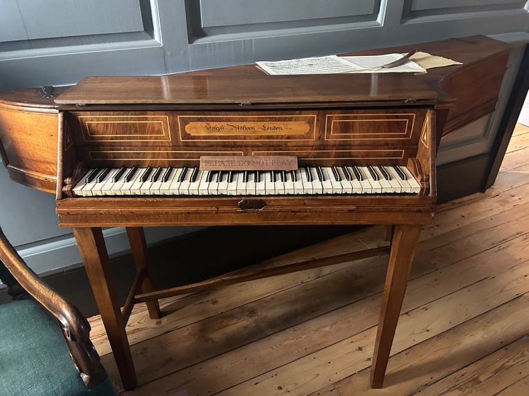 You enter the red door of the gray building on the right and you are in Handel’s house.  You go upstairs and come to a drawing room where Handel composed and rehearsed for many years.  It was in this room that he famously composed the complete “Messiah” in 24 days.  There is a replica of his keyboard: