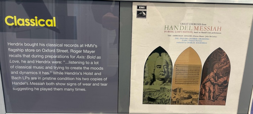 …nearby is this display, noting that Hendrix apparently was inspired by listening repeatedly to a recording of “The Messiah:”