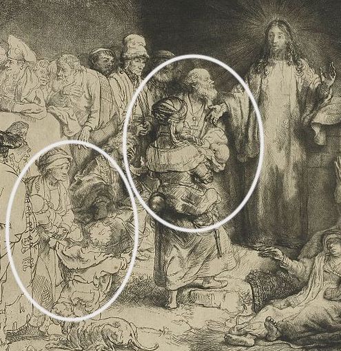 If we read the text carefully and study the scene, we see how he includes all the important characters: people who are hoping to be healed, scholars who like to debate fine points of law, mothers bringing children to receive his blessing, etc. Near the bottom left, we find something not mentioned in the text: